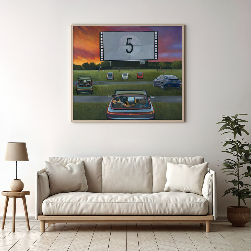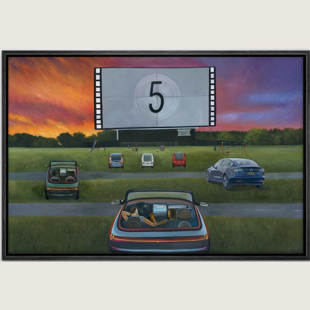 Slow Upload portrays an AI couple immersed in the magic of The Mustang Drive-In—a beloved summer experience in Prince Edward County, where time slows down and intentional living thrives amidst the rush of modern life. The backdrop has a mix of humanoid AI and biological families interacting with the nostalgic exercise of outdoor cinema. The painting addresses a very human luxury of blocking time off to appreciate a film. This painting calls into question what stimuli AI Humanoids would learn from; not to mention how they would show emotional expressions of love. Do robots hold hands? Are they programmed to love or does love drive their programs? Slow Upload sets a scene in which nature’s beauty, the gift of time, the chemistry of romance, and movie-going in general, are examined under the setting sun.